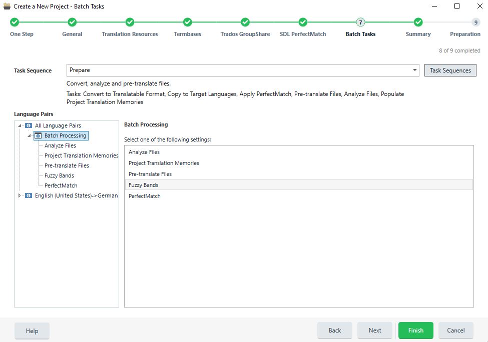 Automatic tasks can be combined in a task sequence. Task sequences are usually run on a project immediately after it has been created, e.g.: converting files to SDLXliff, analyzing files, then pre-translating the project files. Below you see an example of a Prepare task sequence in Trados Studio and the single tasks that the sequence contains: