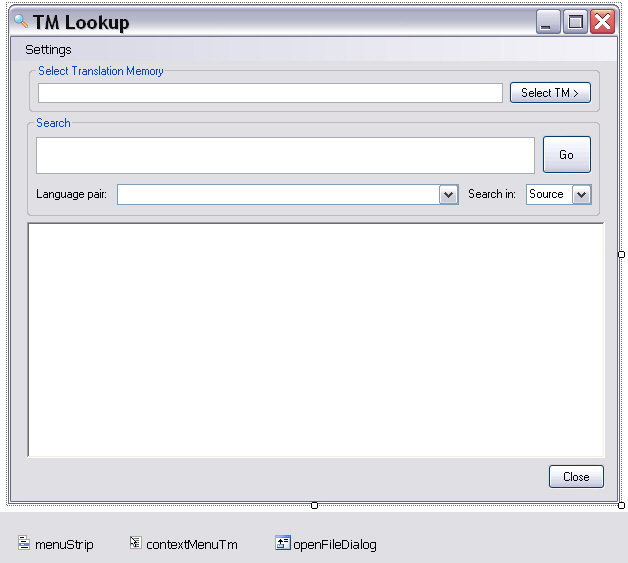 Apart from the main application form we will need other forms for selecting the TM and for configuring search settings. Therefore add a folder called GUI to your project that will contain all the application forms. Then add a form called frmLookup, which will be used to enter search strings and display results.