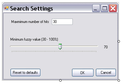 Adding the Search Settings Form This page shows how to implement the user interface for configuring the search settings. The sample application should allow users to set the maximum number of search results as well as the minimum fuzziness value.