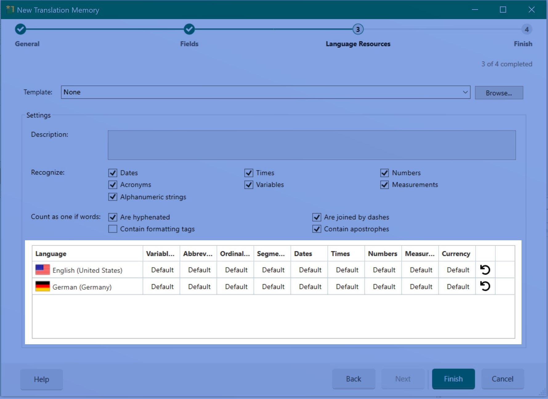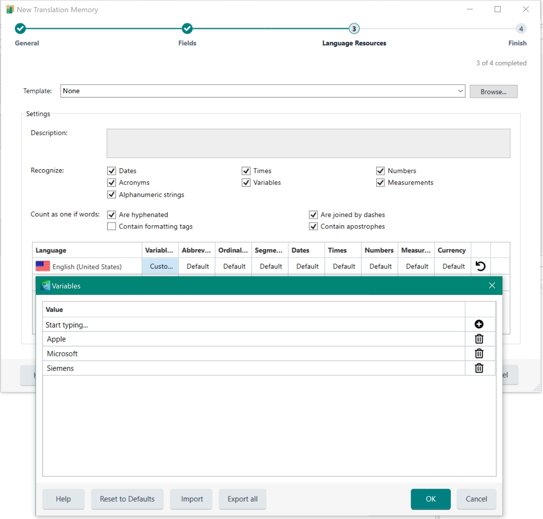 A TM can also be configured with language resources. Language resources contain lists of user-defined variables (see above), abbreviations, ordinal followers, custom segmentation rules, dates, times, numbers, measurements and currency (see image below). Each TM is equipped with a set of default segmentation rules that determine, for example, whether a colon or semicolon should be treated as a segment delimiter or not. Users can add new segmentation rules or change the existing ones. Such information is stored in a so-called language resource.