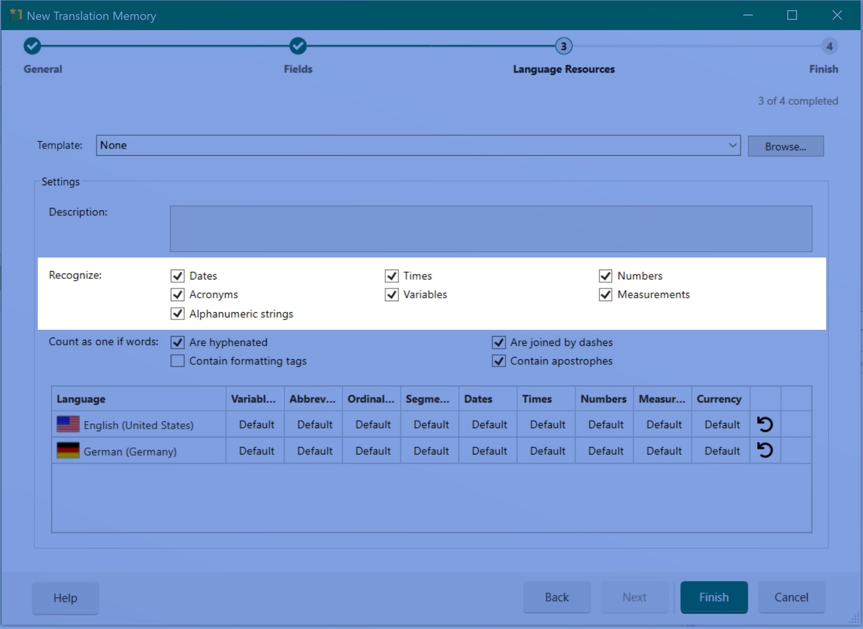 TMs can be configured to recognize certain elements within a segment as so-called placeables, i.e. strings that do not need to be translated, but that are 'placed' inside the target segment. Placeables can be numbers, dates, acronyms, times, measurements, variables and alphanumeric strings. Variables are user-definable strings of elements that do not need or that must not be translated. These can be, for example, product names. Users of Trados Studio can decide during the creation of a TM whether numbers, dates, etc. should be recognized as placeables, or whether they should be treated as 'normal' translatable text. By default, the recognition settings for all these element types are enabled.