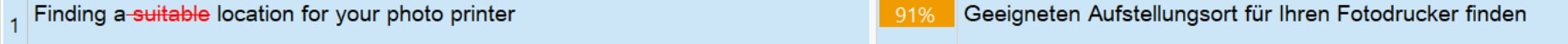 The screenshot below shows an example of a 91% fuzzy match as it was found in a TM. The differences between the segment from the document and the (similar) segment that was found in the TM are highlighted using colors and underline/strikethrough formatting.