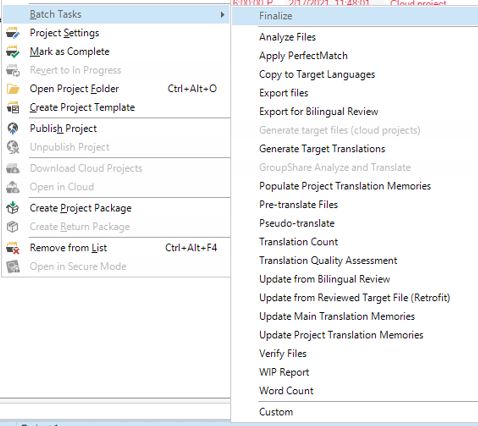 In Trados Studio, you can also run automatic tasks on one or several selected files by right-clicking the file(s) and selecting the required task from the context menu:
