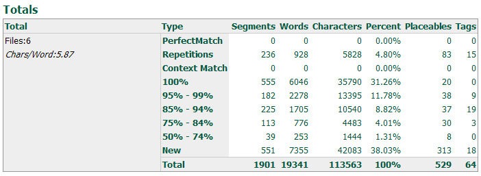 - Automatic tasks: Are performed by the machine, as they do not require human linguistic skills. Examples of automatic tasks include file analysis, word count, file conversion, etc. During or after creating a project you can run one or several automatic tasks on the project files. One important task is the conversion of native file types into a translatable, bilingual format, i.e. into SDLXliff. This is actually the pre-requisite for running any subsequent automatic or manual task such as word count, translation, editing. One of the most common tasks is the file analysis. This task compares the source segments of a document to the TUs of one or several TMs. This task determines the number of matches (i.e. context matches, exact matches, fuzzy matches) that the TMs contain for a particular document as well as the number of repeated segments. This automatic task then generates a report, which can also be printed by the user and which can be used for a cost estimate. Below you see an example of a file analyze report: