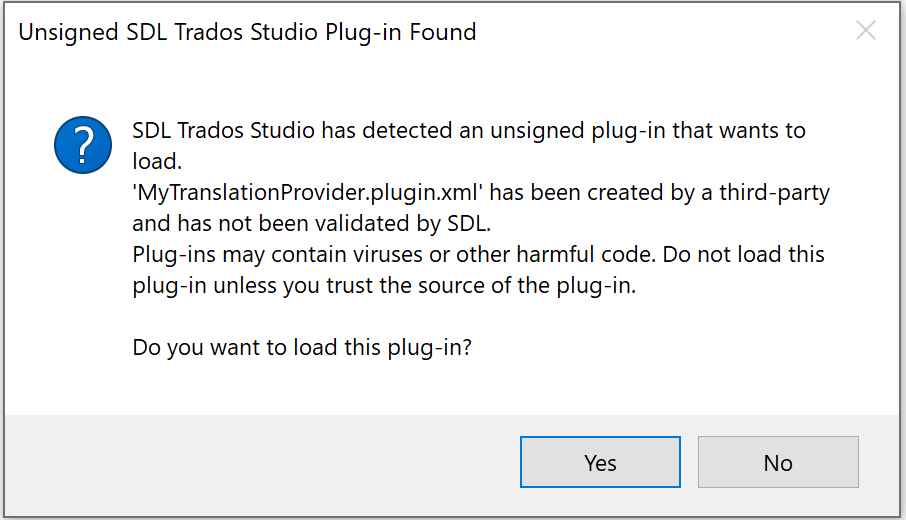 To avoid this message from appearing, you need to submit your plug-in package to RWS for verification. Once verified, your plug-in package will be signed by RWS and the warning message will not appear anymore. To verify the plugin, send an email to app-signing@sdl.com with a link from where the plugin can be downloaded for verification. Once the verification is done, you will receive an answer email with a download link, where you will be able to obtain the signed version of the plugin.